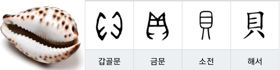 한자 貝는 마노조개 'cowrie'의 모양을 본딴 갑골문자로 출발한다. 동북지방에서는 귀한 재료로써 신석기 시대에 돈의 역할을 했다. 그래서 재화와 보배와 관련된 한자에는 기본자로 꼭 들어가게 된다. 청동기시대는 coin(錢)을 사용하고, 이후 누에를 치면서 幣(화폐, 폐백, 재물..)를 사용하게 되었다. 귀한 비단을 돈의 대용으로 사용하게 된 것이다. 오늘날 돈은 한자로 화폐(貨幣)라고 한다. 영어는 라틴어에서 온 money와 coin을 사용하고 있다.
