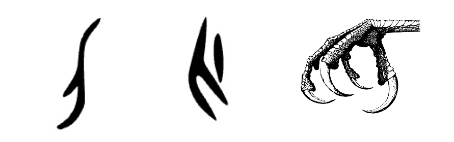 인류, 즉, 호모에렉투스(人)가 태어나서 환경에 즉응 하기 위한 노력을 했을 것이다.(죽지 않기 위해서..) 무엇보다도 제일 경쟁자는 야생동물이었을 것이다. 그래도 인류는 불(火)이라는 강력한 무기가 있었지만, 개개인은 연약한 동물이었다. 그래서 창과 살(활은 나중에 만들어짐)을 만들어 동물들로부터 보호하고 또한 먹거리를 해결하는 일석이조의 무기를 만들었다. 그런데 잡은 동물을 해체할 때는 칼을 사용해야 한다. 날카로운 돌칼등을 이용했을 것이고, 가르고 자르기 위해서는 일자형태보다는 ㄱ자형태의 새발톱과 같은 형태가 훨씬 힘이 적게 들고 유용했을 것이다. 칼도(刀)를 보면 더욱 새발톱과 같다는 생각이 든다. 아니 공룡발톱과 같은 형태이다. 아무리 漢字관련된 자료를 보아도 直刀(청동검과 같은 형태, 구석기시대는 돌을 깬 형태)에 대한 설명만 나오지만, 刀형태에 대해서는 시원한 설명이 없다. 또한 낫의 작은 형태인 karambit(爪刀)이라는 인도네시아의 칼도 있지만, 후대(철기)의 칼이다.
