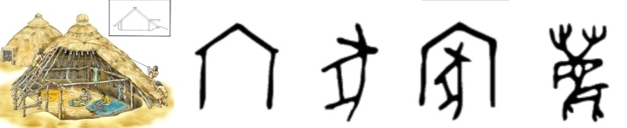 집은 형태적인 면에서 이미 新石器때부터 갖추어져 있다가, 그림 形態로 사용하기 始作했다. 甲骨文字도 그림文字에서 발달한 형태이다. 신석기시대 집은 그림과 같은 움집이고, 이 형태가 갑골문자(왼쪽에서 두번째)의 (집면, 宀)이다. house의 기본 형태를 보여준다. 현재는 집과 관련된 한자의 부수로 사용된다.